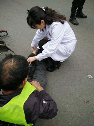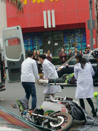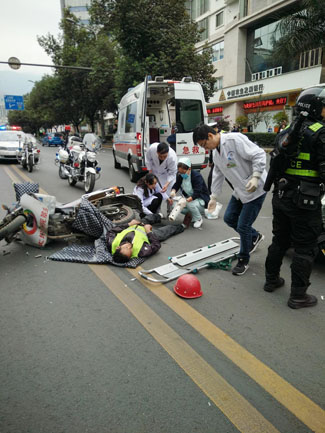 2017年11月24日中午12点左右,九龙医院办公室正在开会中,突然听到“砰”的一声,探头往窗外一看在我院门前发现一起车祸,院长立马组织医务人员携带救护器械第一时间赶到了车祸现场,所有医护人员立即投入紧急急救。