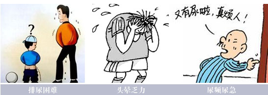 1、尿频、尿急、尿不尽,出现排尿困难的症状,有时是有尿很急到排尿的时候就没有了,要等好久才能尿出来。