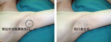 ◆腋臭切除除腋臭手术:为传统的除腋臭手术,其效果肯定,可以根治.在局麻下进行,将含有大汗腺的皮肤及皮下组织切除,然后缝合.术后口服抗菌素,避免上臂外展活动,术后10-14天拆线,留有一条线状瘢痕.若含大汗腺范围较大,需多次进行手术,否则术后瘢痕有可能较宽,其并发症可能有感染,伤口裂开、术后瘢痕较宽.